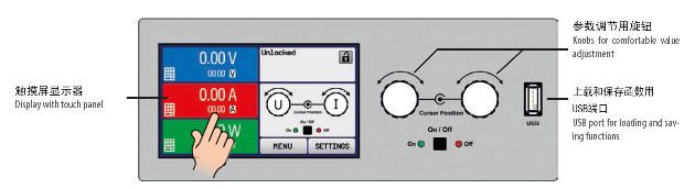 設(shè)定與實(shí)際輸出電壓、電流與功率都清晰顯示于圖形顯示器上。彩色的TFT屏幕為點(diǎn)觸式,用一個(gè)手指就能控制所有功能。